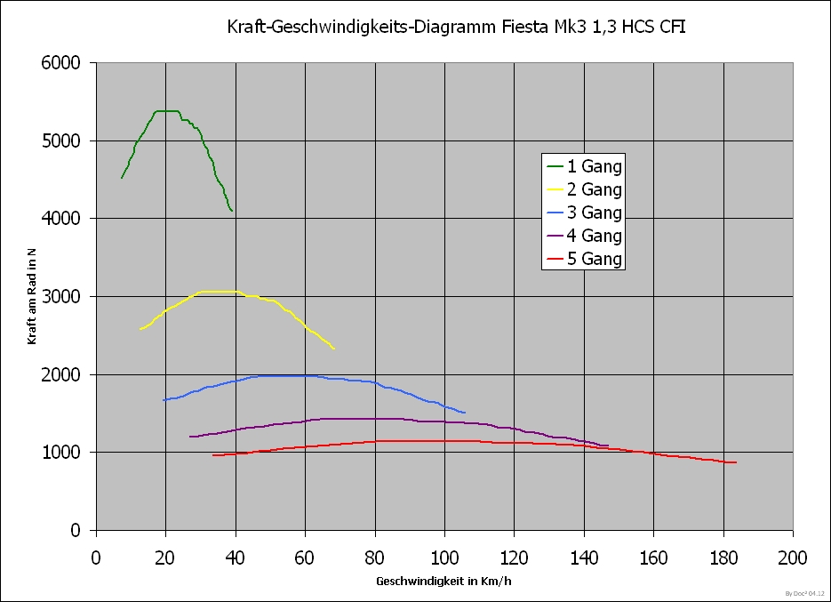 Im Anhang dazu das Kraft-Geschwindigkeits-Diagramm für den Fiesta Mk3 1,3 HCS CFI.