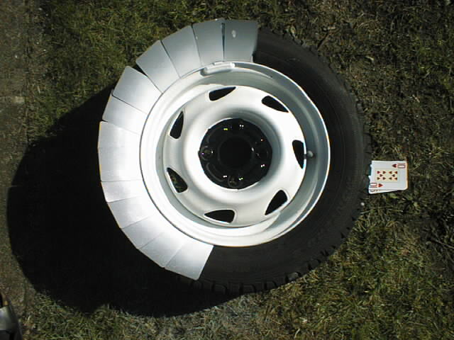 Die Karten rundum, überlappend zwischen Felgenhorn und Reifen fest einklemmen. Nun kann man die vordereitete Felge mit dem Rand sauber lackieren. Klappt bei Stahl- und Alufelgen.