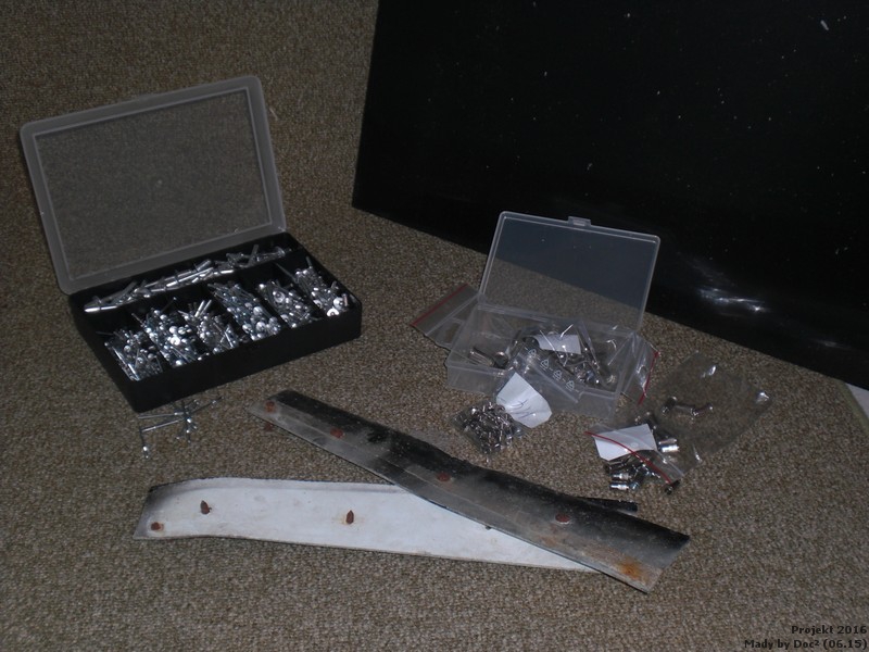 Dort zu sehen Nieten, Nietmuttern, Alublech und dunkel im Hintergrund eine PVC Platte in harter Ausführung. Aus diesen Teilen werden maßgeschneiderte Spritzlappen entstehen welche größer, strapazierfähiger und vor allem optimal passen sollen.