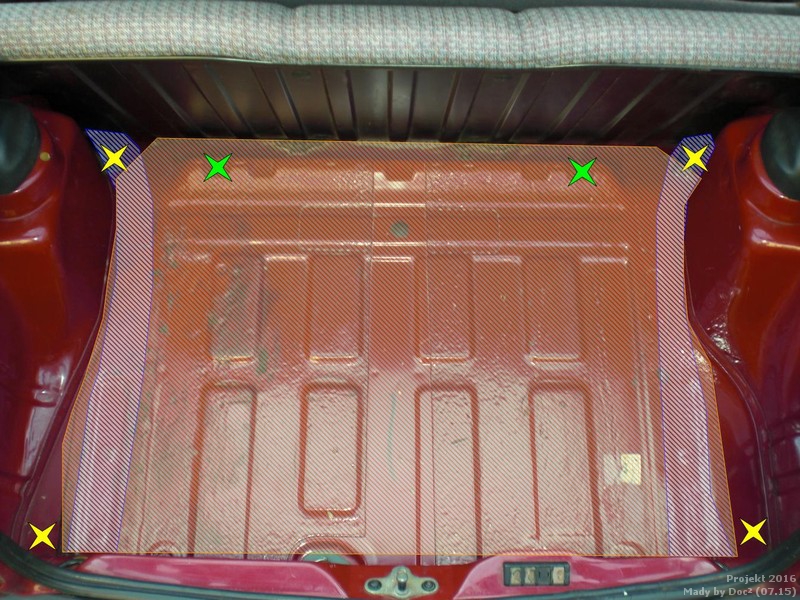 Ursprünglich wollte ich die Halteösen in den vier Ecken vom Kofferraum verschrauben, Markierung gelbe Sterne.