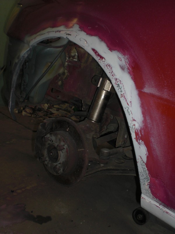 Und der Kotflügel vorn rechts hat im Zuge der Lackierung vom Frontbereich auch schon seine ersten Schichten Grundierung bekommen.