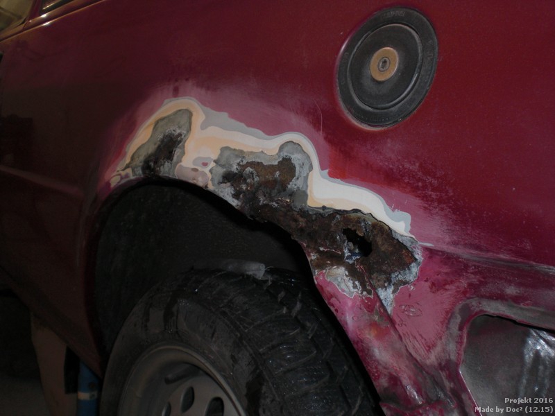 Der Rost hat hier schon reichlich zugeschlagen, aber nur von außen und Löcher gab es auch noch nicht, nur ein paar unschöne Rostporen. Aber diese werden bald nicht mehr zu sehen sein. Das heißt: perfekt wird diese Lackierung sicher nicht, aber zum Rallyefahren wird es reichen.