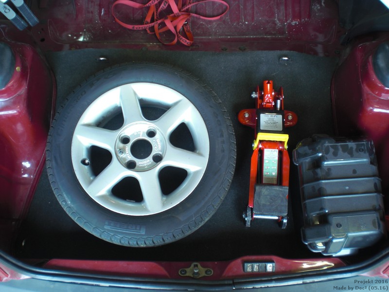 Ersatzrad, Werkzeugkiste und Wagenheber passen so in den Kofferraum, fehlen nur noch die Befestigungen. Aber dazu später mehr.