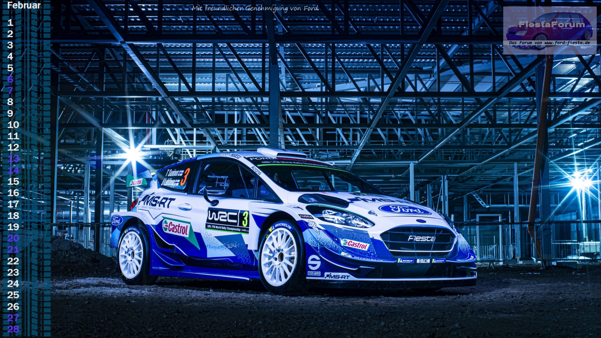 Zwar sind die WRC Fiesta bei der gerade eben gelaufenen Rallye Monte Carlo nicht ganz so schnell gewesen, erst auf Rang 8 ist der erste zu finden, abgschelagen vom führenden Toyota mit knapp einer Minute, aber dafür sah er dabei wenigsten gut aus. Ähnlich unserem Kalenderblatt für den Februar 2021. Dieses schmückt ein Pressefoto vom WRC Fiesta.