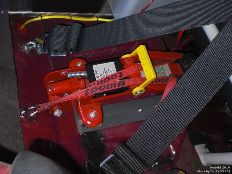 Die Wagenheber Befestigung ist nun auch fertig. Mit Grundplatte, Haltebock und Spangurt. |