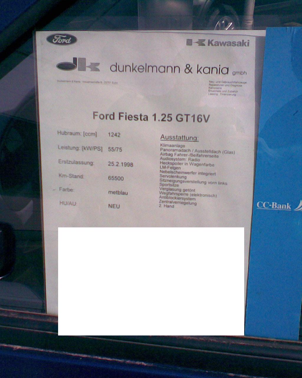 Ich dachte da erstmal an nette 40-60 Federn, und Angeleyes, achja, welche Cd-radios passen in die Fiestas, hab mir sagen lassen das die andere Maße haben!