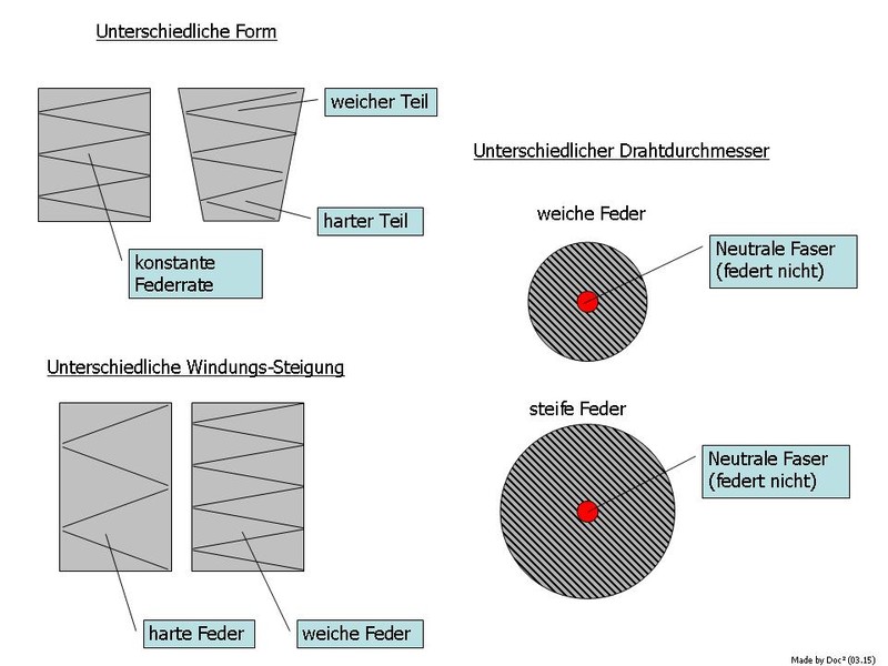 Wenn man jetzt alle drei Möglichkeiten miteinander kombiniert so könnte man eine tonnenförmige Feder mit unterschiedlichen Windungssteigungen und Drahtdurchmessern fertigen. Und je nach dem welcher Teil entsprechend geformt wird, könnte man so eine kompakte leichte Feder bauen die anfänglich sehr weich und komfortabel reagiert, aber bei ansteigender Belastung hart und sprichwörtlich Bretthart wird.