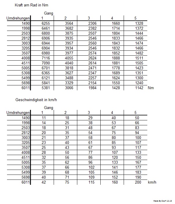 Die Werte der oberen Tabelle sind in Nm angegeben und die untere zeigt die Geschwindigkeit in km/h.