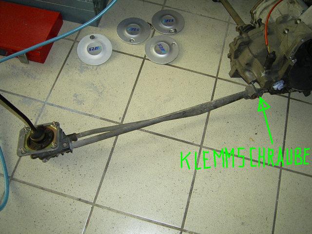 2)Die Klemmschraube der Schaltstange am Getriebe lösen, so das sich die Schaltstange auf der Getriebeschaltstange bewegen lässt, nicht ganz abbauen.