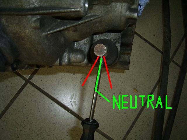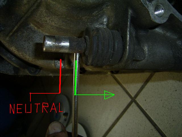 3)In der Schaltstange am Getriebe befindet sich ein Loch, dort von unten z.B. einen passenden Kreuzschraubendreher reinstecken und damit die Schaltstange in Neutral-Position stellen, von da aus dann die Stange nach vorn in das Getriebe schieben, bis der Gang (es ist der 4.) richtig einrastet.