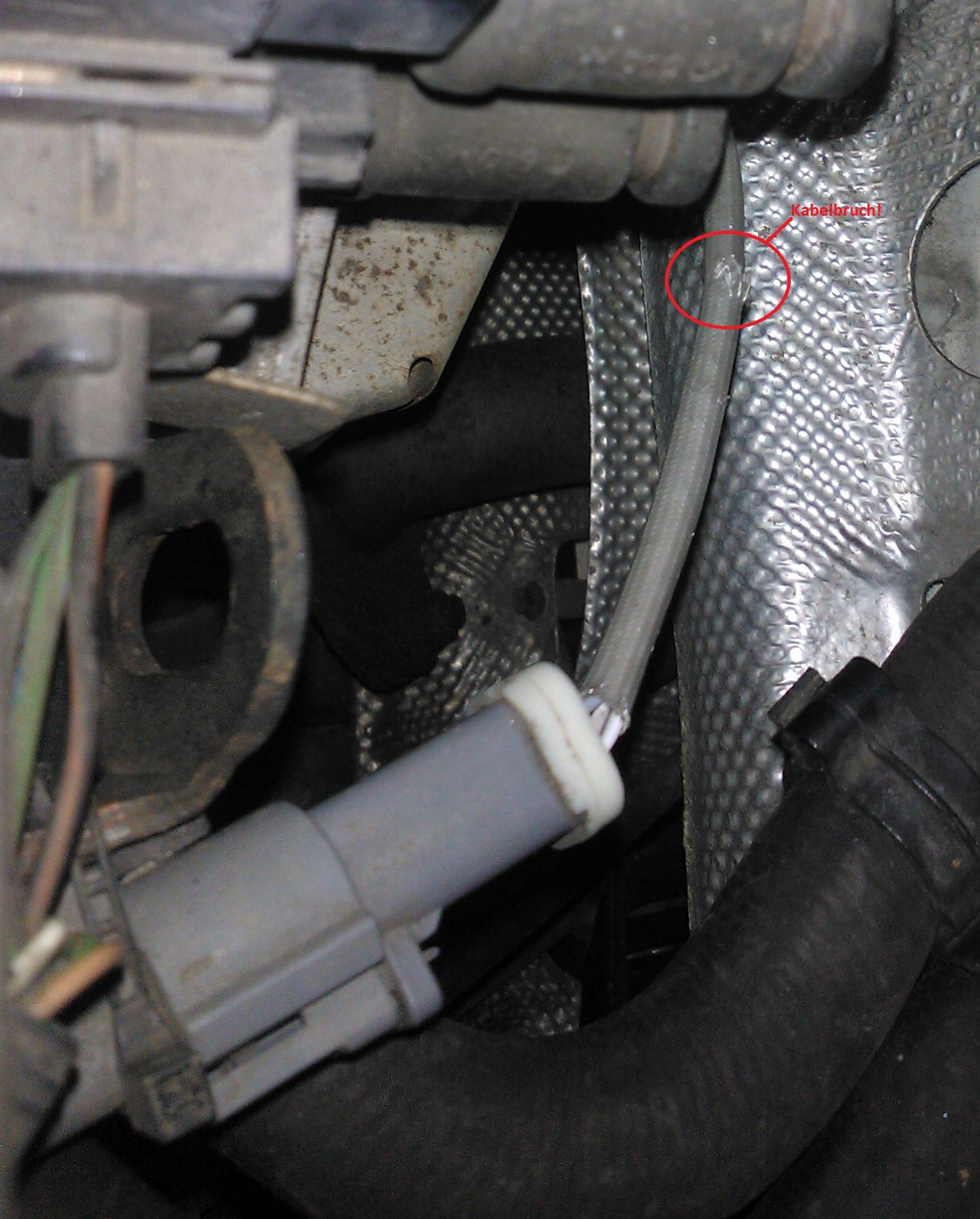Wenn in der Ummantelung zwei weisse, 1 graues und ein schwarzes Kabel sind und das Kabel zum Sensor im ersten Bild führt wär mein erster Gedanke "Lambdasonde". Steckanschluss lösen und dann versuchen das Kabel zu reparieren. Vielleicht vor der Reparatur die Baterie abklemmen.