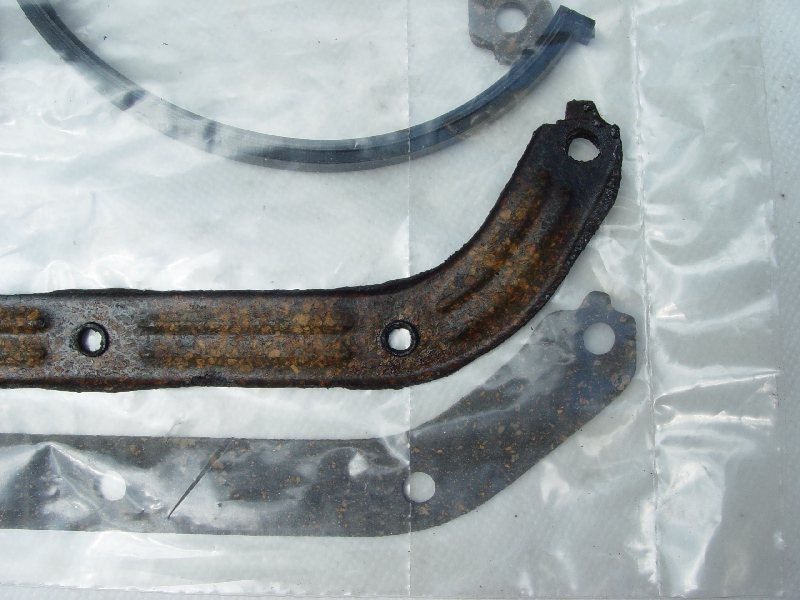 Hatte da also die Karre hochgebockt und den rechten Innenkotflügeleinsatz entfernt, um im Radkasten ein bißchen Rost wegzumachen, da fällt mir so ein fetter Rostpickel seitlich auf der Ölwanne ins Auge. Ich kratze das Ding weg und was passiert? Ich habe eine Ölquelle erschlossen. Gut, besser so, als wenn man beim Fahren von einem plötzlich ölleeren Motor überrascht wird. Also alles abgebaut, Ölwanne raus, saubergemacht und - hoffentlich - alle löchrigen Stellen zugeschweißt, zumindest die die schon sehr verdächtig aussahen. Blöderweise ist beim Ausbau eine der Korkdichtungen der 4-teiligen Ölwannendichtung zerrissen, so daß ich dachte, man gönnt sich am Besten eine neue. Also zu ATU gefahren, wo ich sie einst schon mal geholt hatte (damals war der Motorsimmerring zum Getriebe kaputt). Sollte ja kein Problem sein. Ok, anscheinend gibt's baujahrabhängig zwei Typen, wie ich dort auf dem Display sehen konnte, aber vorrätig hatte man sie dort diesmal nicht, also wäre nur bestellen und warten und wieder hinfahren gegangen. Wollte die Karre aber möglichst rasch wieder zusammenschrauben, so daß ich dachte, daß ich sie dann auch gleich irgendwo über's Internet ordern könne. Das erspart mir die Fahrerei und länger dauert es auch nicht. Außerdem war der Preis von damals 17 Euro auf inzwischen stattliche knapp 30 Euro gestiegen.