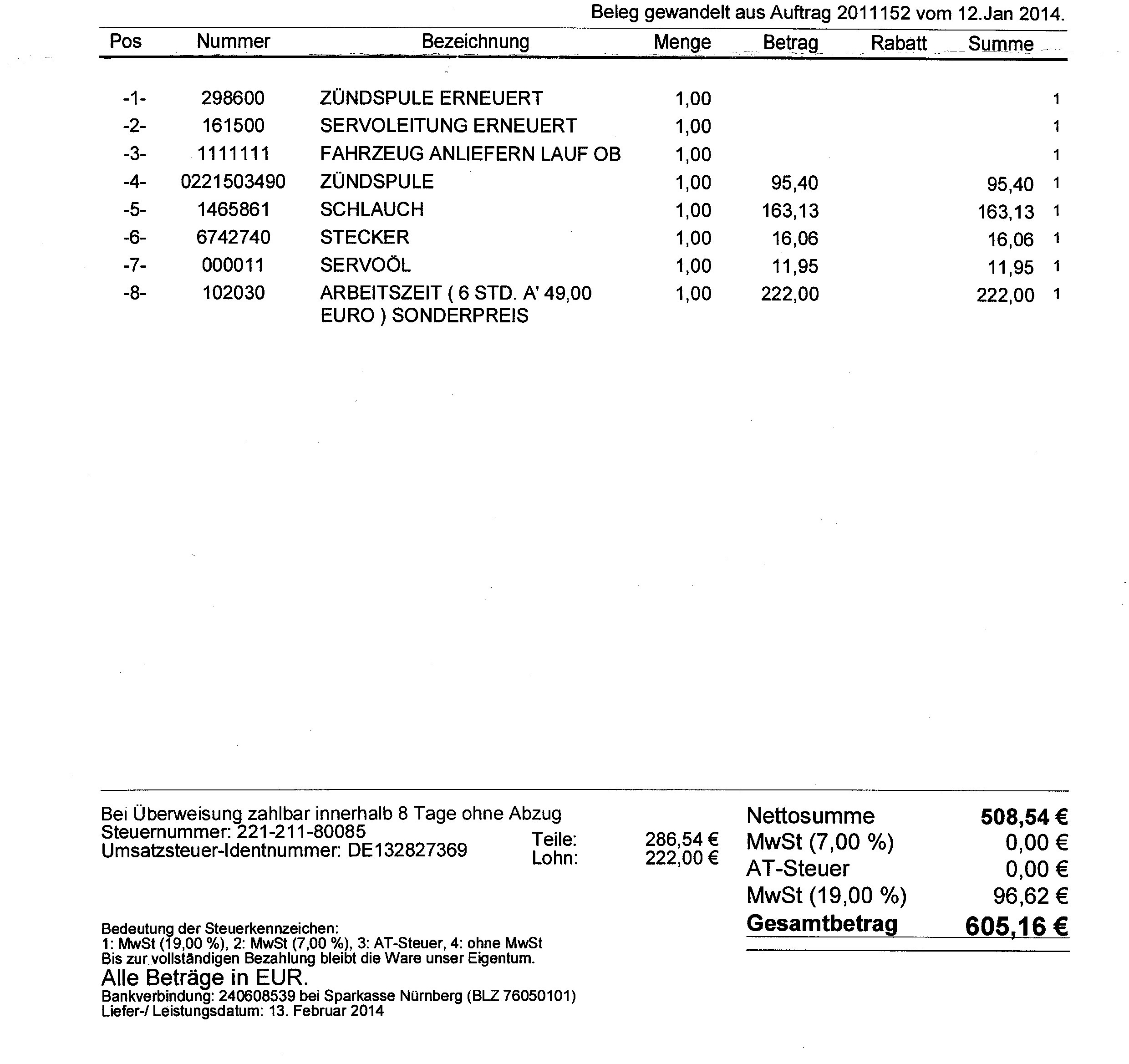 Am Samstag dann der Schock, die Rechnung beläuft sich auf 550 Euro (der defekte Zündblock wurde gutgeschrieben), als Arbeitszeit wurden 6 Stunden angesetzt.