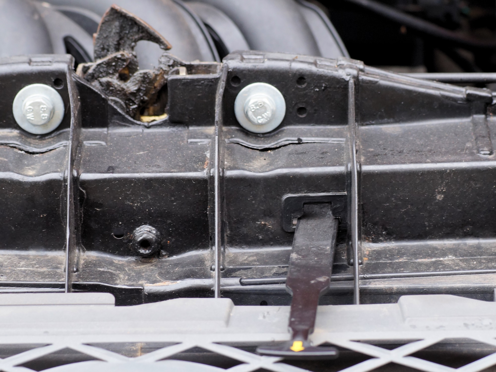 Die lange Kunststoffzunge ist abgerissen, die den Fanghaken von der Entriegelungsöse zieht. Daher läßt sich die Motorhaube nicht mehr öffnen.