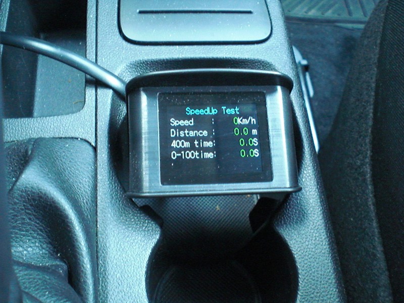 Hier wird, leider nur sehr klein, die aktuelle Geschwindigkeit, die Beschleunigungsstrecke und die Zeit für 400 m sowie zum erreichen der 100 km/h angezeigt.