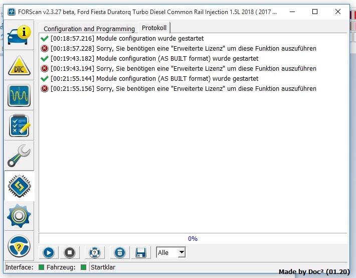 Zunächst bekahm ich zugriff zum Fahrzeug und konnte auch alle Fahrzeugdaten sowie Sensordaten auslesen, aber der Zugriff auf die erweiterten Einstellungen blieb mir verwert.